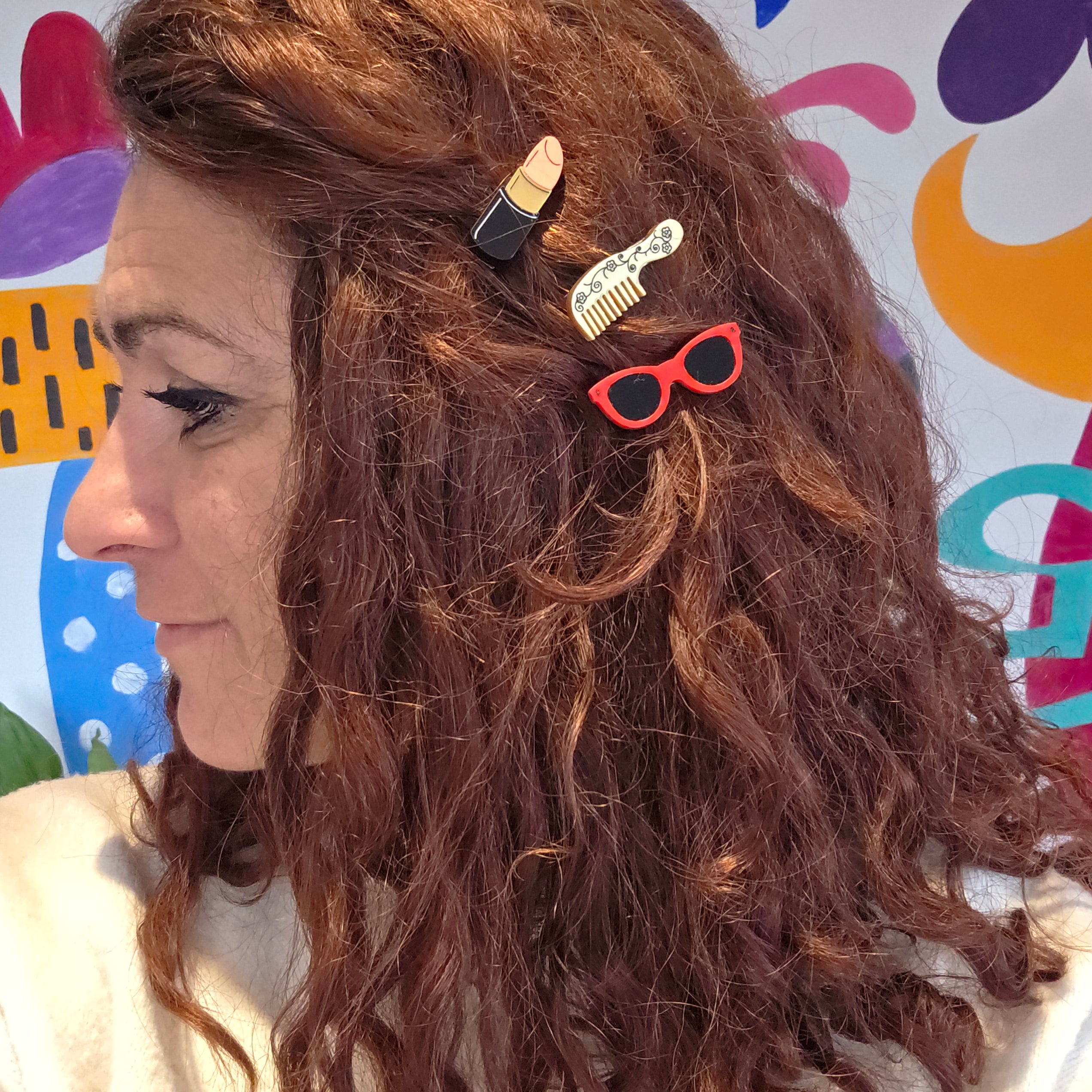 Small, fun, and colorful hair clips that can be worn alone or all together.