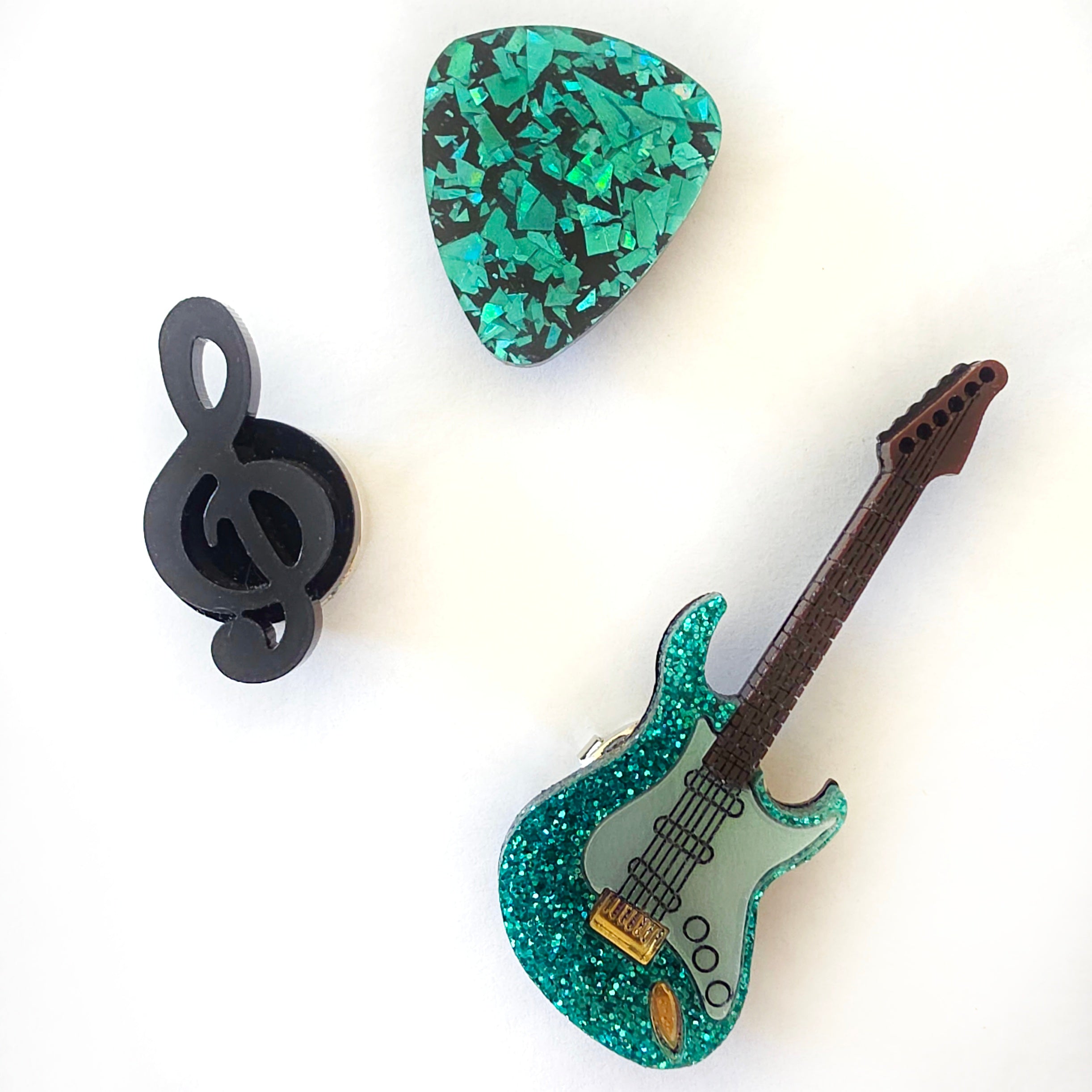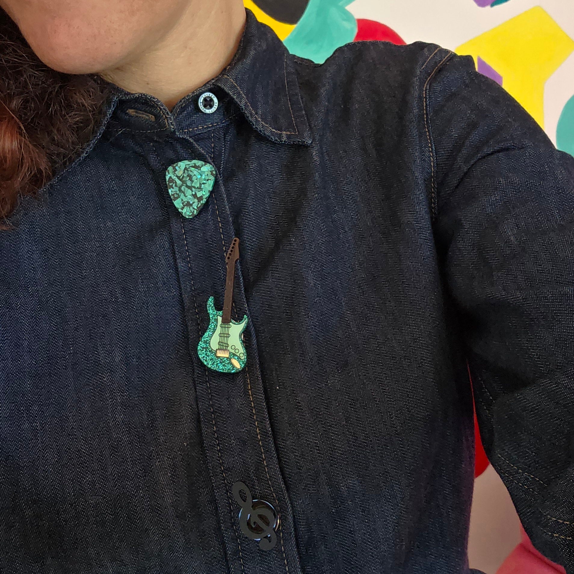 Add a touch of style with these button covers featuring an electric guitar and pick — perfect for a true rock music lover! Worn all three together, they tell a story, but you can also choose to buy or wear just the guitar ;)