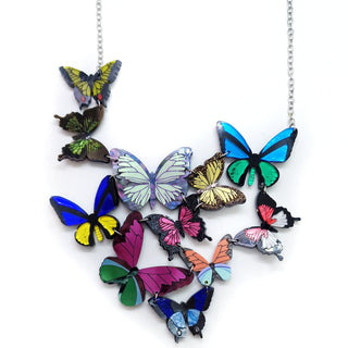 Collana maxi décolleté con farfalle in plexiglass colorato modellate a mano per dare alle ali un'idea di movimento