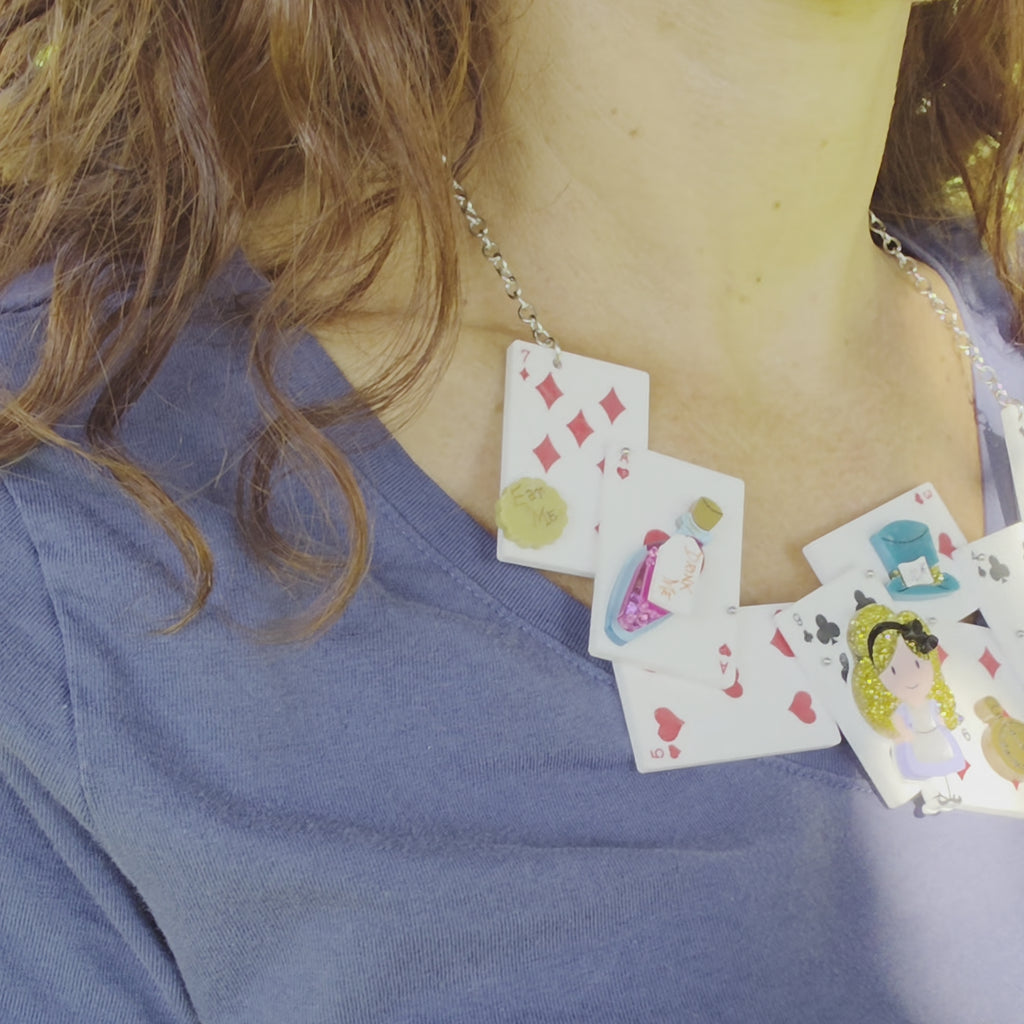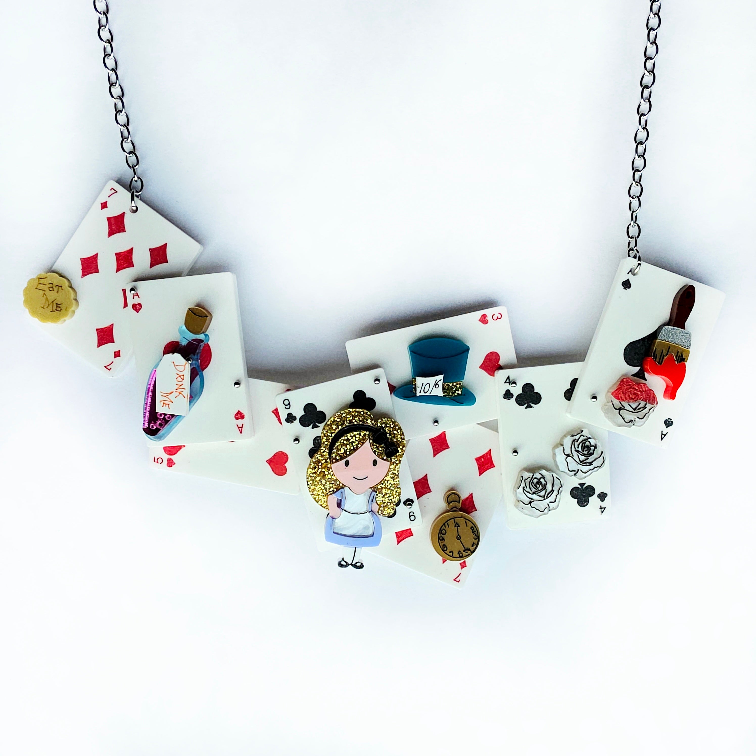 Alice walks along a path of cards in Wonderland, and you can carry her with you wherever you go by wearing this necklace.
