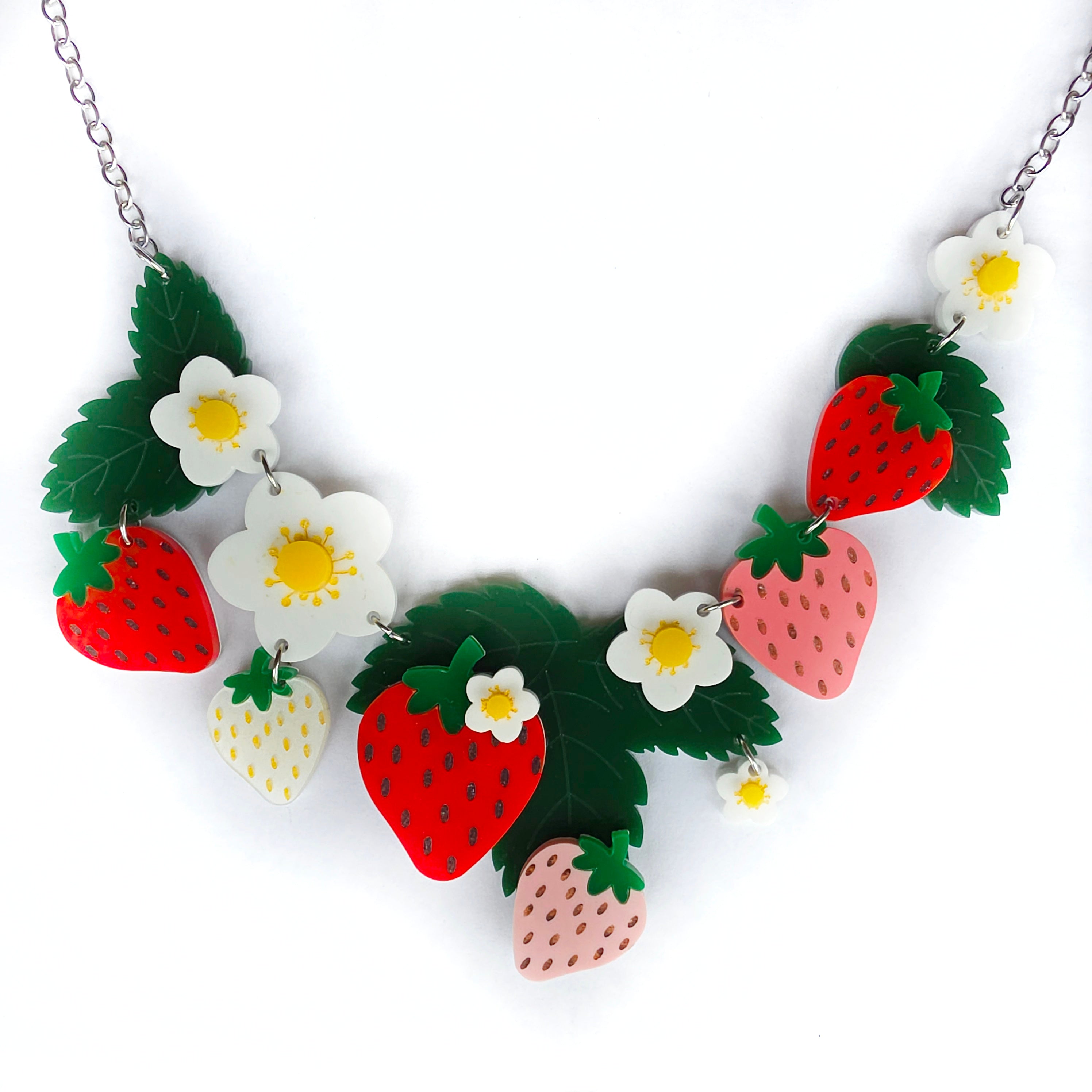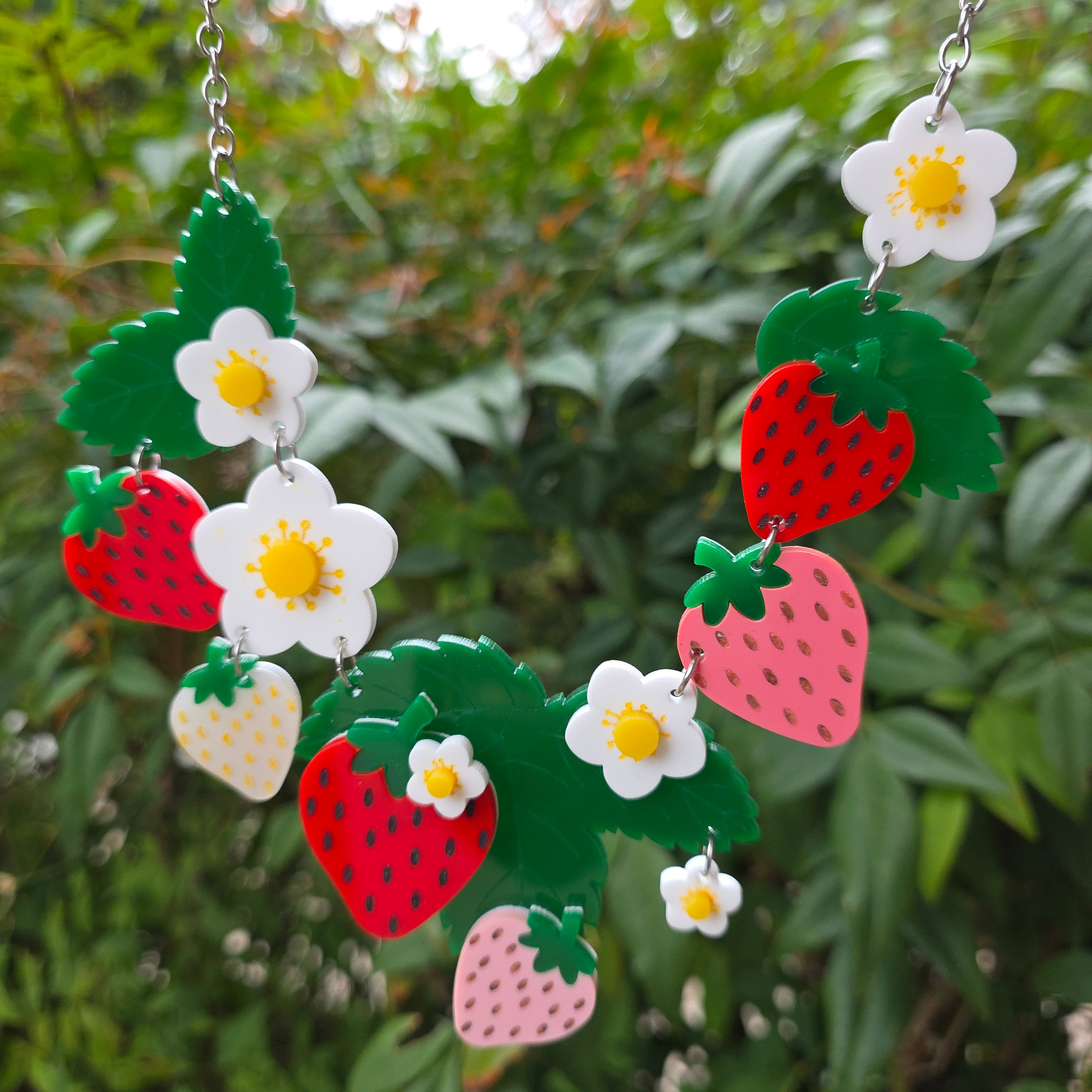 Con questa collana saluterai la primavera e potrai sfoggiare colorate fragole in tutte le fasi della loro maturazione, delicati fiori e grandi foglie verdi.