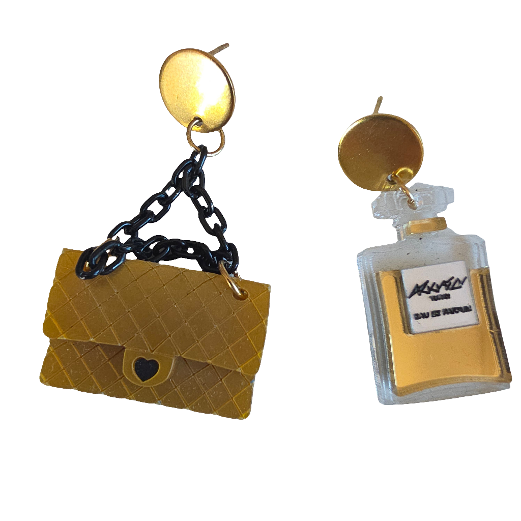 Orecchini moda borsa e profumo.